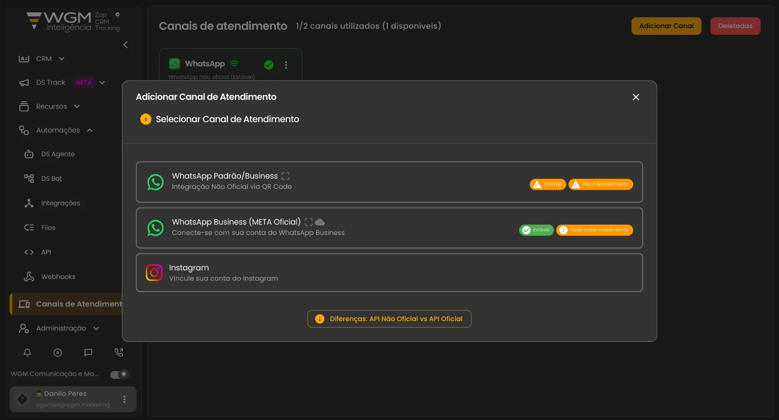 Sendo transparente: em qualquer ferramenta que use conexão via QR Code (não oficial), o risco de bloqueio pelo WhatsApp existe, embora tenhamos proteções de comportamento humano para mitigar isso. Por isso, a WGM recomenda fortemente o uso da API Oficial (Meta), que também disponibilizamos. Com a API Oficial, seu número é blindado, 100% seguro contra banimentos e tem estabilidade garantida pela própria Meta.