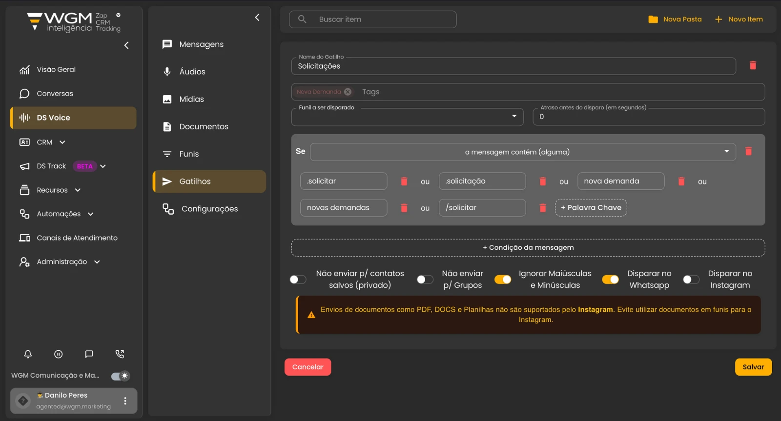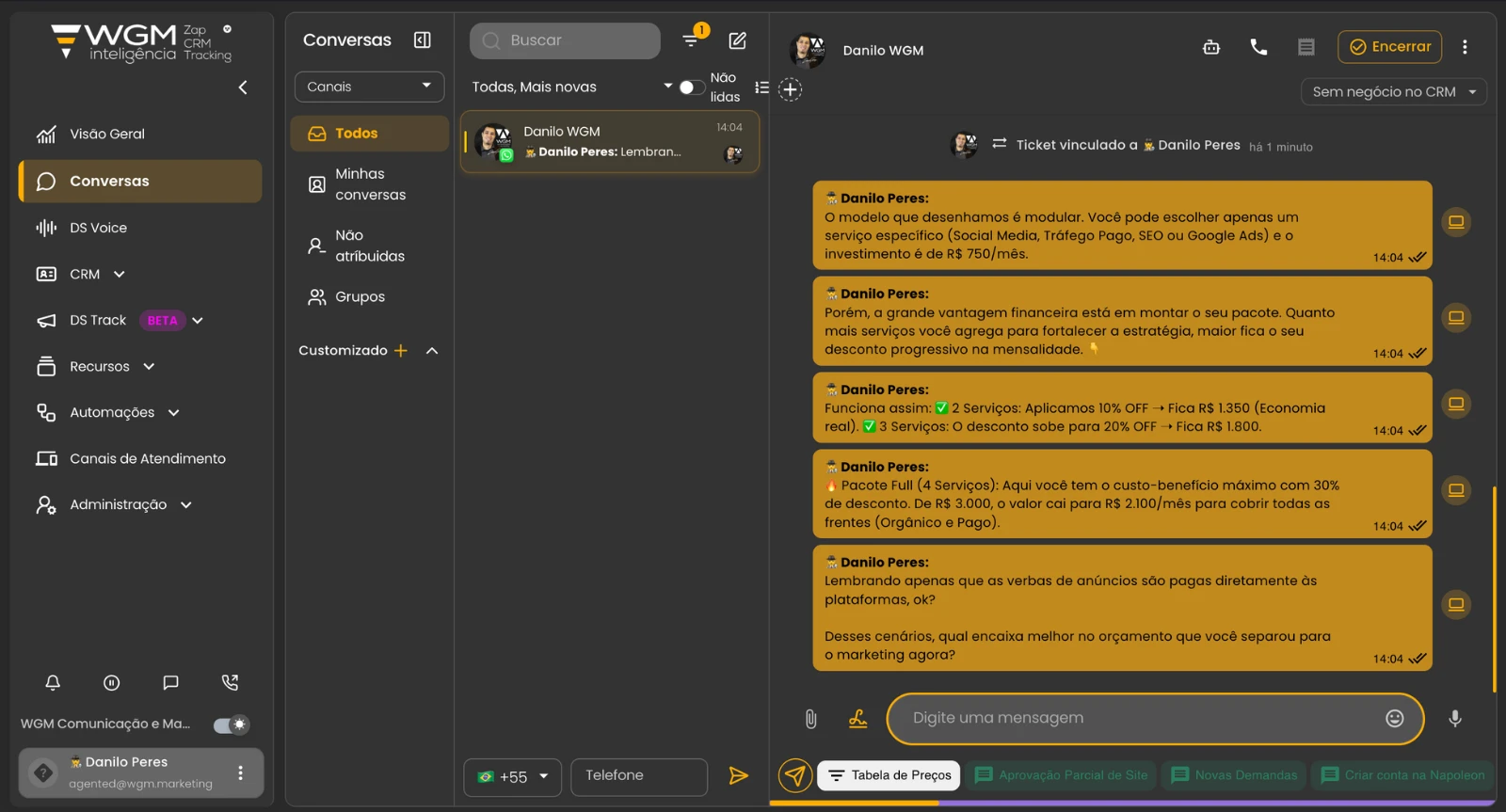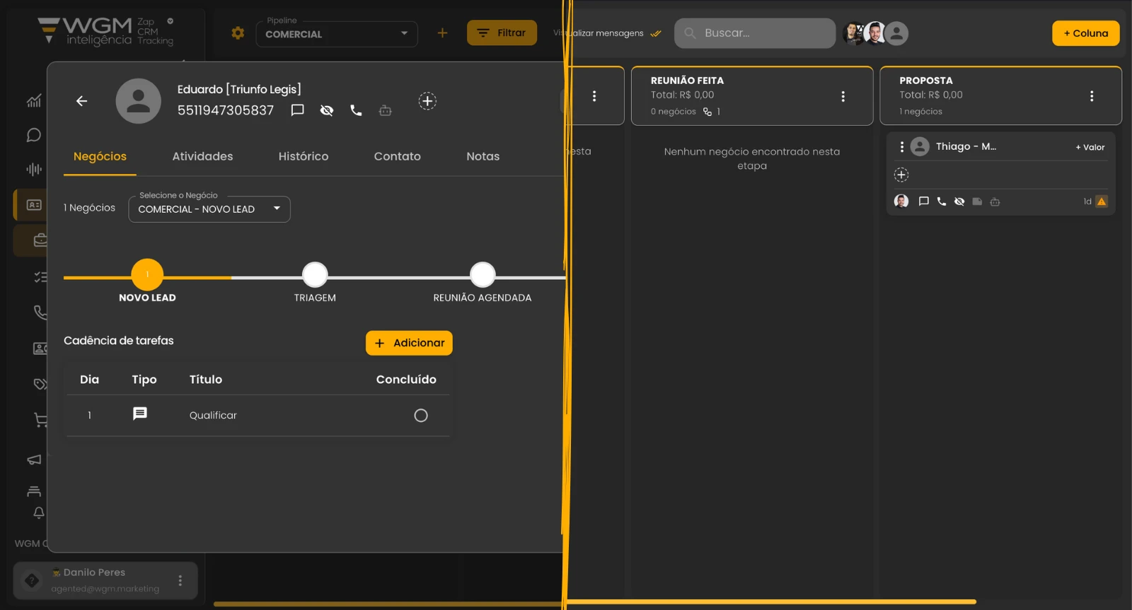CRM (Gestão de Relacionamento com o Cliente) é o “cérebro” comercial da WGM. Ele organiza seus clientes em um funil visual (colunas como “Novo”, “Em negociação”, “Vendido”). Ele serve para garantir que nenhum cliente seja esquecido. Você saberá exatamente quem precisa de retorno hoje, evitando perder vendas por falta de acompanhamento (follow-up).