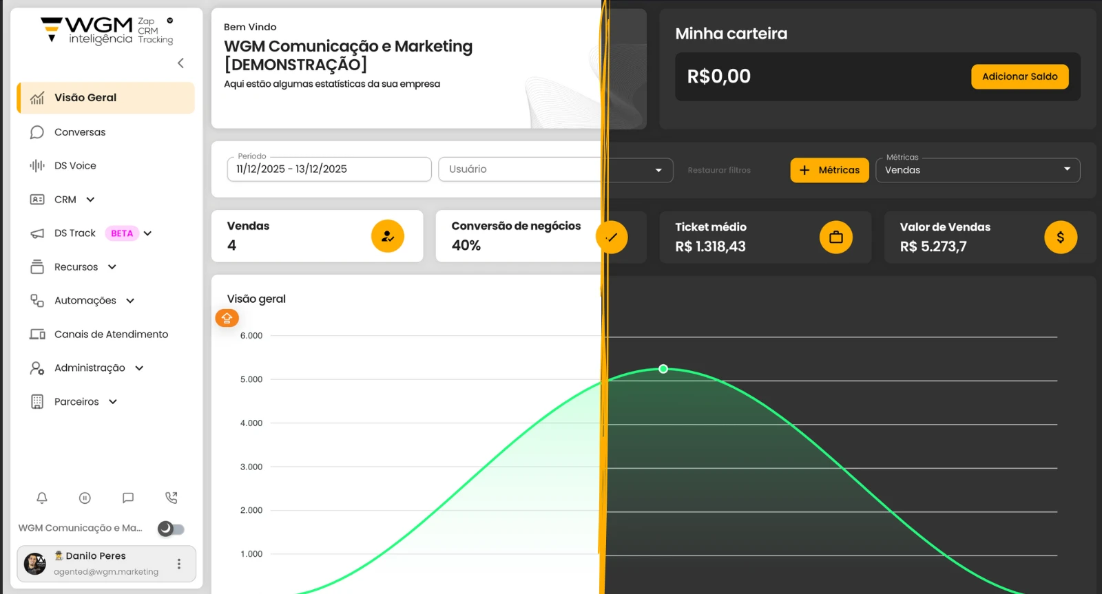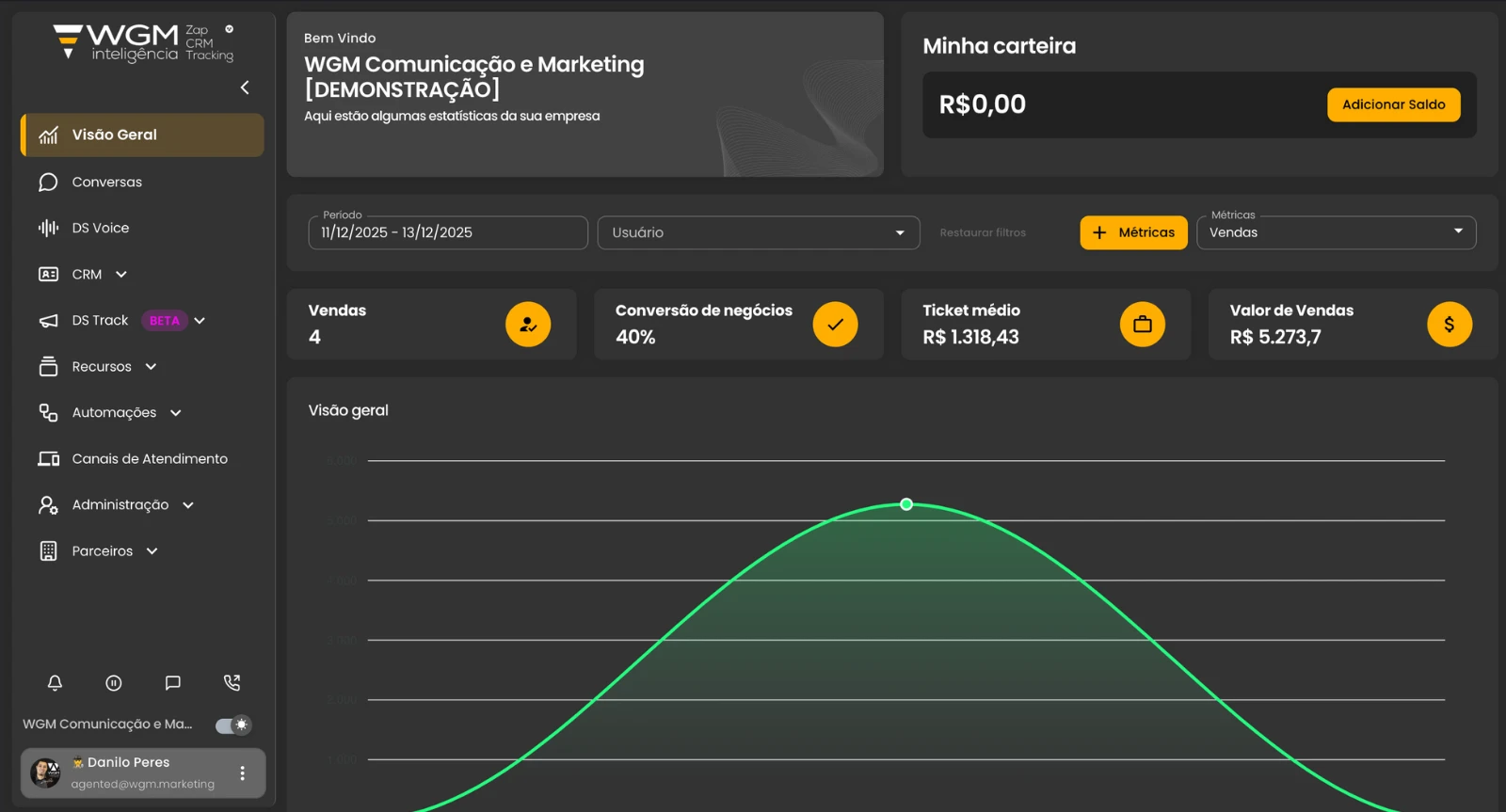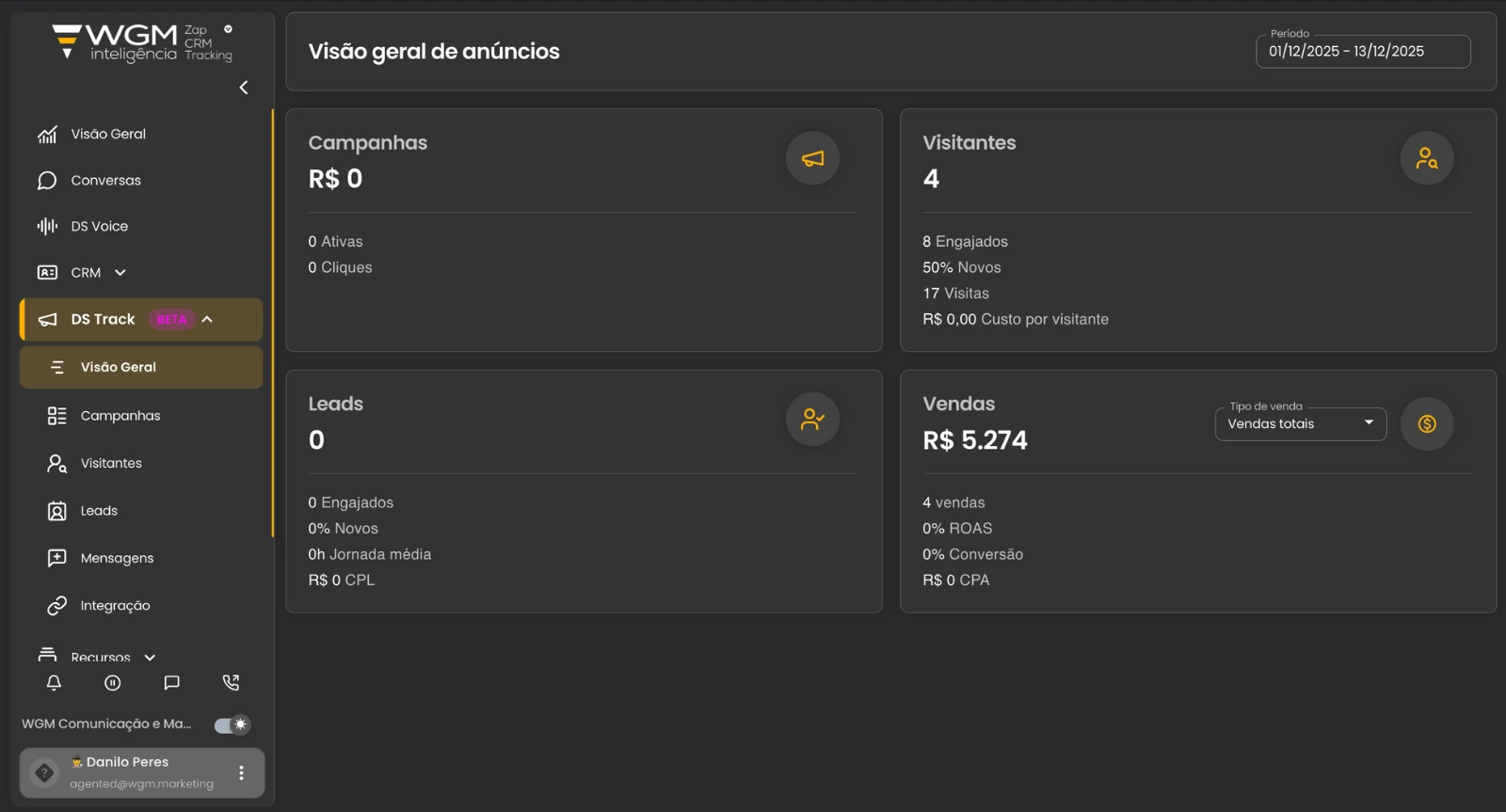 Visão Geral ● Relatórios ● Funis de Vendas ● Conversas Centralizadas ● Multiatendimento ● Único Número ● CRM ● Controle Comercial ● Central de Atividades ● Ligações ● Contatos ● Tags ● Produtos Comerciais ● Track ● Visão das Campanhas ● Relatório de ROI ● Controle sobre o Investimento ● Leads ● Chat Interno ● Agendamento de Mensagens ● Agendamento de Reunião ● Automação ● Bot ● Agente de IA ● Inteligência Artificial ● API ● Webhooks ● WhatsApp por QR Code ● API Oficial do WhatsApp ● Instagram ● Direct ●